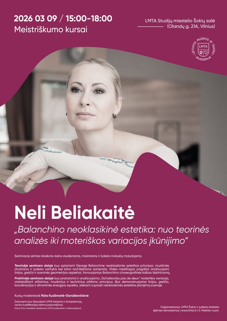 Kviečiame į baleto artistės, pedagogės Neli Beliakaitės meistriškumo kursus „Balanchino neoklasikinė estetika: nuo teorinės analizės iki moteriškos variacijos įkūnijimo“.