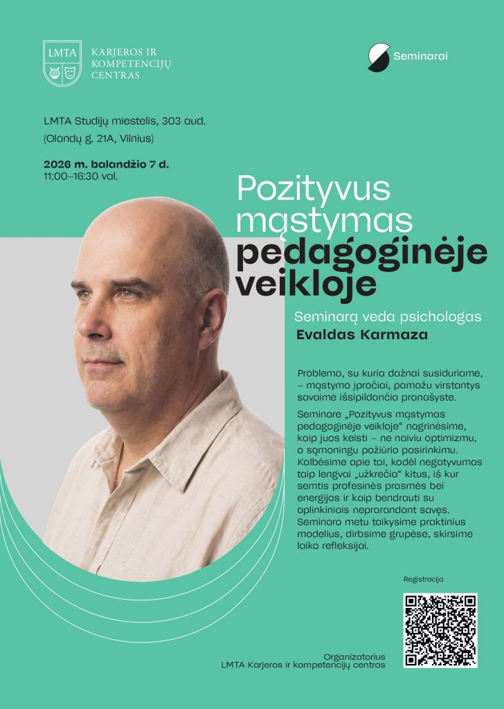 Seminare „Pozityvus mąstymas pedagoginėje veikloje“ nagrinėsime, kaip juos keisti – ne naiviu optimizmu, o sąmoningu požiūrio pasirinkimu. Kalbėsime apie tai, kodėl negatyvumas taip lengvai „užkrečia“ kitus, iš kur semtis profesinės prasmės bei energijos ir kaip bendrauti su aplinkiniais neprarandant savęs. Seminaro metu taikysime praktinius modelius, dirbsime grupėse, skirsime laiko refleksijai.